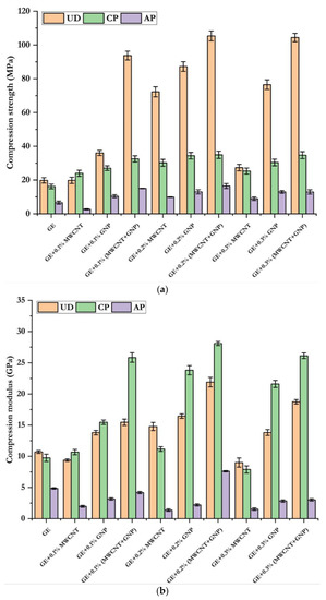 - The addition of MWCNT, GNP, and a hybrid combination of these enhanced the compressive strength by 17–499%, 84–158%, and 39–145%, respectively, for UD, CP, and AP laminates. The configuration hierarchy for compressive strength was UD > CP > AP for all nanofill combinations.