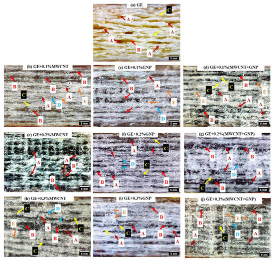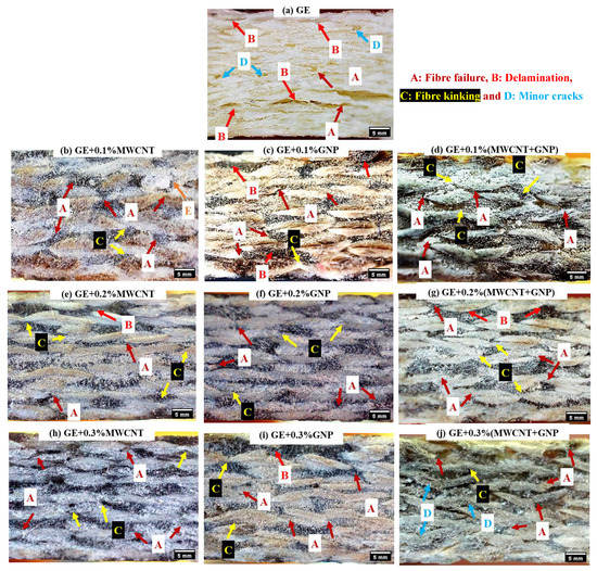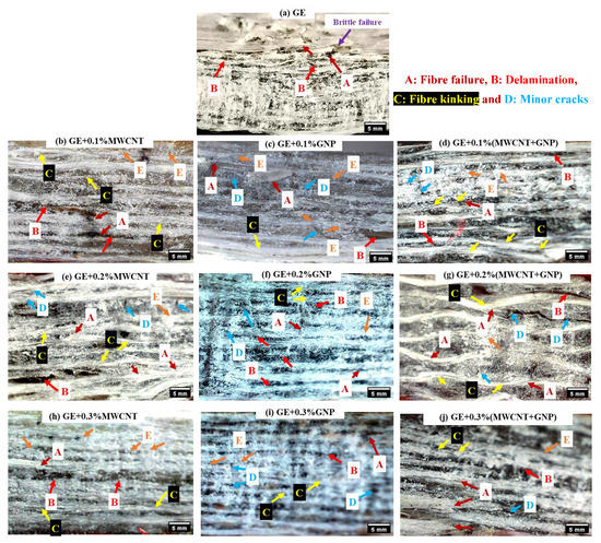 The interlaminar shear failure of neat and nanocomposites are shown in Figure 16, using optical micrographs. The GE composite (Figure 16a) clearly showed fibre failure and delamination. However, in 0.1 and 0.2% GE nanocomposites (Figure 16b–g), there was no evidence of delamination, which justifies the increased ILSS value. In the case of GE nanocomposites with 0.1–0.2% of MWCNT and GNP nanofillers, minor delamination with fibre failure was evident. However, the failure modes were insignificant in 0.1–0.2% (MWCNT + GNP) laminates.