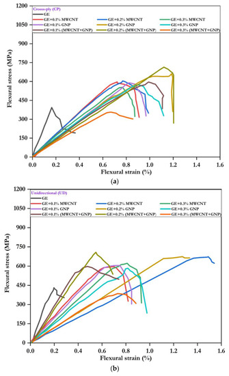 - The addition of MWCNT and GNP increased the flexural strength of UD, CP, and AP laminates by 39–54%, 51–69%, and 37%, respectively. The hybrid combination of 0.1–0.2% (MWCNT + GNP) exhibited superior flexural strength by 39–62%, 51–80%, and 28–49% higher flexural strength for UD, CP, and AP laminates, respectively.