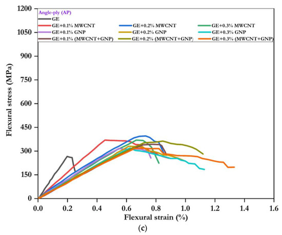 The flexural stress–strain response for the neat UD, CP, and AP laminates with variable weight fractions of nanofillers is shown in Figure 10. Up to a strain of almost 0.2%, the response of all composites was similar, except for the difference in slopes. The flexural stress increased in all composites up to the first drop in the load, beyond which plastic deformation occurred. After the elastic limit, damage evolution varied according to the constituents of the laminates. In Figure 10a–c, it was observed that the UD laminate showed superior flexural performance over CP and AP samples. The response showed the peak stress of the specimen with substantial nonlinear deformation. The flexural performance response was improved from the neat laminate to laminates with nanofillers, irrespective of their stacking sequence.