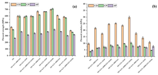 Flexural properties of UD, CP, and AP composites: (a) flexural strength and (b) flexural modulus.