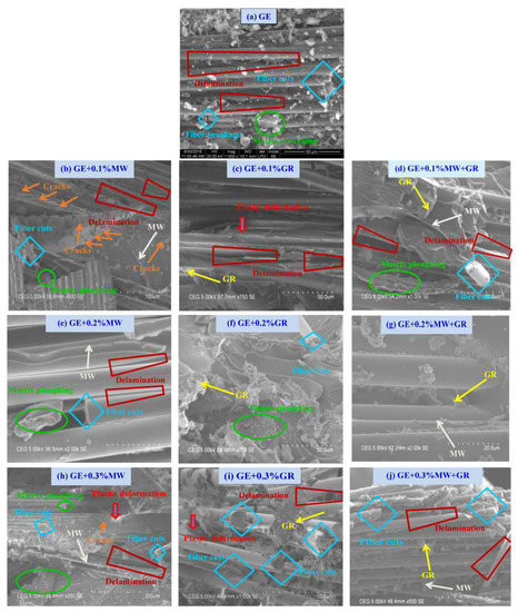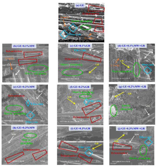 The SEM micrographs of flexural failure for the UD samples with 0.1%, 0.2%, and 0.3% nanofillers are shown in Figure 13a–j. Pure GE (Figure 13a) showed fibre cuts with delamination, visible matrix cracks at multiple locations, and matrix ploughing. In the case of GE samples filled with 0.1% fillers (Figure 13b–d), delamination, matrix ploughing, and fibre cuts were typical failure modes. However, shear cracks were observed only in samples filled with MWCNT, i.e., in GE + MWCNT and GE + 0.1% (MWCNT + GNP). This might indicate that adding GNP particles prevent crack propagation under flexural loading. The micrographs of GE filled with 0.2% and 0.3% fillers (Figure 13e–g) showed excellent dispersion of nanofillers. Some of the MWCNT and GNP were broken in a brittle manner, and some were pulled out from the surface of the GE. Micrographs in Figure 13c,f,i showed an excellent bridging effect in the interfacial region of the glass fibre, nanofillers, and epoxy matrix. Due to the increase in the wt.% of nanofillers, crack propagation was prevented, showing improved performance. Finally, from these micrographs, a combined effect of 0.2% MWCNT + GNP nanofillers suggested with both resin and fibre suggested a better improvement in the flexural performance of the nanocomposites.