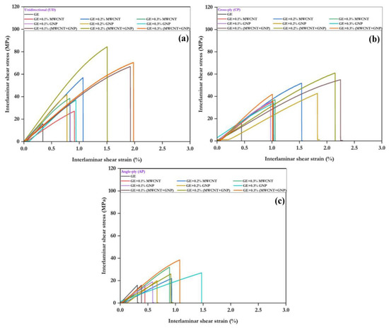The ILSS response of neat GE laminates and their nanocomposites is shown in Figure 14. In Figure 14, it was evident that the addition of MWCNT and GNP fillers improves the ILSS response of GE composites. However, the response was changed based on the constituents of the composites and their configuration. Among all the configurations, UD composites exhibited better performance than the CP and AP composites. In the case of pure GE composite, the response increased linearly and reached maximum stress with strain and then failed abruptly, indicating the brittle nature of the sample. When nanofillers were added, the stress increased linearly almost halfway and then exhibited nonlinearity, indicating plastic deformation. Beyond the nonlinearity, the response reached a peak load and dropped suddenly. The ILSS response increased up to a filler percentage of 0.2%; beyond this, it decreased. The ILSS response of CP configurations with nanofillers was better than the UD and AP composites.