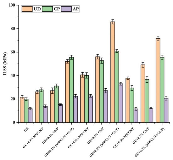 Figure 15 shows the ILSS values of GE composites with different nanofillers and configurations. The ILSS values were compared in this figure. Adding 0.1–0.2% of MWCNT and GNP separately improved the ILSS of UD, CP, and AP laminates by 21–160%, 41–165%, and 18–131%, respectively. The hybrid combination (MWCNT + GNP) greatly enhanced the ILSS of UD, CP, and AP by 142–298%, 179–206%, and 90–181%, respectively. The decrease in ILSS at 0.3% was due to the agglomeration of nanofillers. Table 5 shows the ILSS values of UD, CP, and AP laminates with different wt.% of nanofillers.