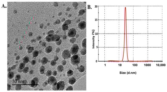 Characterization of lignin-loaded carbon nanoparticles (L-CNPs): (A) transmission electron microscope image for lignin nanoparticles (L-NPs) decorated with carbon nanoparticles (C-NPs) producing L-CNPs; (B) DLS analysis of L-CNPs.