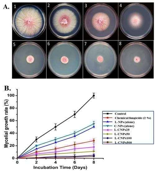 The antifungal activity of the prepared L-CNPs at four different concentrations (25, 50, 100, and 500 mg/L) against F. verticillioides was evaluated following the growth rate method to select the more effective concentration of L-CNPs. Briefly, F. verticillioides mycelial discs (7 mm in diameter) cultured on potato dextrose agar (PDA) plates were carefully cut from the colony’s plate edges and deposited on the synthetic media plates supplemented with the above concentrations of the formed L-CNPs. The inoculated plates were then incubated for 4, 6, and 8 days at 25 °C ± 1. Following incubation, the mycelial radial growth of F. verticillioides was evaluated in all plates, and data were given as the percentage of inhibition []: