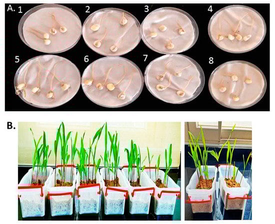 Continued work was also done for more evaluation of the seed germination and plant growth after 14 days post-sowing after transplanting another similar group of the treated seeds in sterilized plastic pots (10 cm diameter × 20 cm height) filled with a mixture of soil and sand at 3:1 (w/w), pH 7.0.