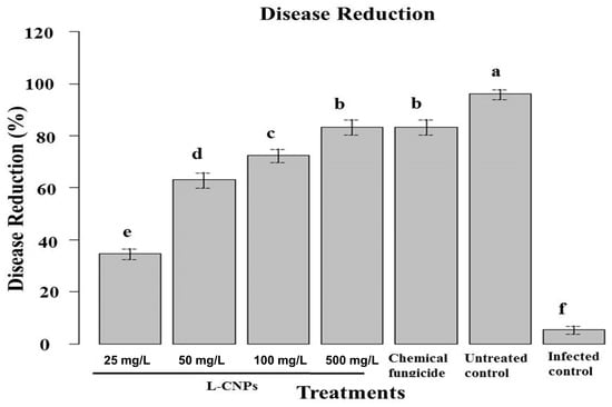 Effect of seed treatments with L-CNPs at different concentrations on disease reduction in maize inoculated with F. verticillioides (21 days after inoculation) in pot experiments. Data are expressed as mean ± standard deviation (SD) of three replicates. Mean values with different letters are significantly different according to the least significant difference (LSD) test at p < 0.05.