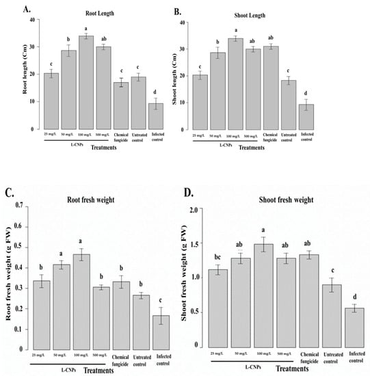 Effect of the treatment with L-CNPs on the length and fresh weight of maize samples compared to the chemical fungicide and the untreated controls. (L-CNPs25, L-CNPs50, L-CNPs100, and L-CNPs500) refer to L-CNPs concentration applied to seed for priming (A); effects of the treatments with L-CNPs on the shoot length; (B) shoot length; (C) root fresh weight; and (D) shoot fresh weight compared to the untreated control. The values were recorded on seedlings at 14 DAS. Letters in the figure, if different, indicate statistically significant differences of p < 0.05 between treatments.