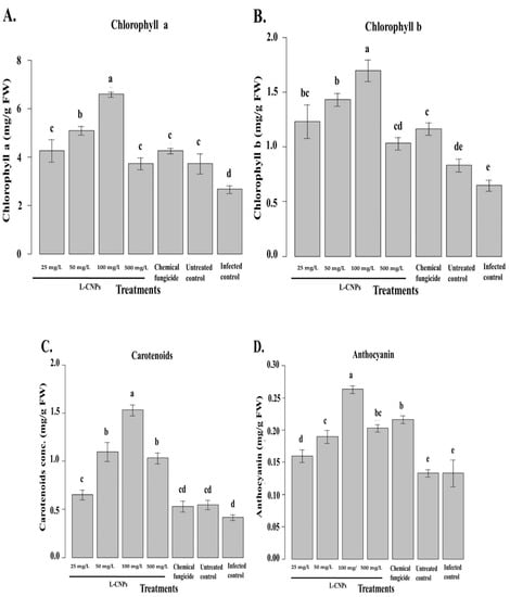 The chlorophyll a/b ratio has been proposed as a metric for assessing crop response to environmental adversities, diseases, and stressors []. Some stresses, in particular, can cause the conversion of chlorophyll a to b via the enzyme Chl an oxygenase []. As a result, the increase in chlorophyll b, which was not offset by a sufficient rise in chlorophyll a, demonstrates that the higher L-CNPs dose had phytotoxic effects. Figure 6C depicts the results obtained in terms of carotenoids. L-CNPs25, L-CNPs50, and L-CNPs100 treatments resulted in significant increases in carotenoids, but the L-CNPs500 doses had little effect on the carotenoid levels. In the case of anthocyanin (Figure 6D), the L-CNPs25, L-CNPs50, and L-CNPs100 treatments significantly increased its content. L-CNPs500 and the samples treated with the chemical fungicide also increased the anthocyanin content compared to control samples, although the magnitude of these increases was much smaller than that induced by the first three concentrations mentioned above.