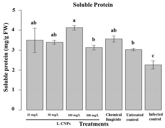 Effect of the treatment with L-CNPs on the available soluble protein of maize samples compared to the chemical fungicide and the untreated controls. (L-CNPs25, L-CNPs50, L-CNPs100, and L-CNPs500) refer to L-CNPs concentrations applied to the seed for priming. The values were recorded on seedlings at 14 DAS. Letters in the figure, if different, indicate statistically significant differences of p < 0.05 between treatments.