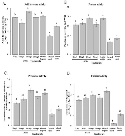 Effect of the treatment with L-CNPs on the defense-related enzymes in maize leave samples compared to the chemical fungicide and the untreated controls. (L-CNPs25, L-CNPs50, L-CNPs100, and L-CNPs500) refer to L-CNPs concentrations applied to the seed for priming. The values were recorded on seedlings at 14 DAS. (A) Acid invertase activity; (B) protease activity; (C) peroxidase activity, and (D) chitinase activity compared to the untreated control. Letters in the figure, if different, indicate statistically significant differences of p < 0.05 between treatments.