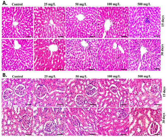 For additional histopathological analyses, the liver and kidney tissues of all treatment rates were fixed in 10% neutral formalin. The formalin-fixed tissue was dehydrated in ethanol concentrations of 70%, 80%, 90%, 95%, and 100% before being immersed in paraffin and cut into 5 m thick sections. Hematoxylin and eosin (H&E) were used to stain these sections, which were then inspected under a light microscope (Olympus, Tokyo, Japan).