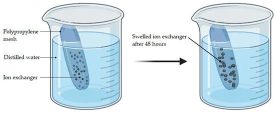 The gravimetric method is a widely used technique for estimating swelling coefficients. This coefficient is typically expressed as a ratio of the change in volume to the original volume. In this study, the gravimetric method was used to estimate the swelling coefficients (Ksw) of the ion exchangers. The dry and swollen polymers were weighed, and Ksw was calculated using the following Equation (1):