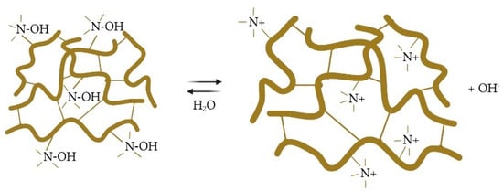 The mechanism of the remote interaction effect implies the complete exclusion of the direct interaction of acidic and basic polymers due to the constantly changing morphology of the surface. For the explanation of this effect, in our case, we can consider the dissociation of the ion exchangers Lewatit CNP LF (H+ form) and AV-17-8 (OH− form) by the formation of free H+ and OH− ions, respectively. Then, released H+ and OH− ions form weakly dissociated water molecules and leave the functional groups of polyelectrolytes activated and stabilized by intramolecular interactions. Moreover, according to Pearson’s hard and soft acid and bases (HSAB) theory [], which states that “hard acids prefer to bond to hard bases, and soft acids prefer to bond to soft bases” [], released hard acid H+ (Figure 2) and hard base OH− (Figure 3) similarly form water molecules and leave the functional groups of ion exchangers stabilized and activated by intramolecular interactions. As a result, concentrations of oxonium (H3O+) and OH− ions became significantly higher around the Lewatit CNP LF and AV-17-8, respectively. This gradient presumably makes the concentrations of neutral water around the ion exchangers in this interpolymer system lower than the concentrations around the singly used ion exchangers, and enhances the dissociation of counter ions from the ionic groups in the polyelectrolytes [] (p.3). The result of the remote interaction is the mutual activation of the initial ion exchangers Lewatit CNP LF and AV-17-8 in the interpolymer pair and, as a consequence, the transition of their macromolecules to a highly ionized state, which further leads to a significant increase in the sorption properties towards the europium and scandium ions of polyacids and polybases in the interpolymer system “Lewatit CNP LF:AV-17-8” (X:Y).