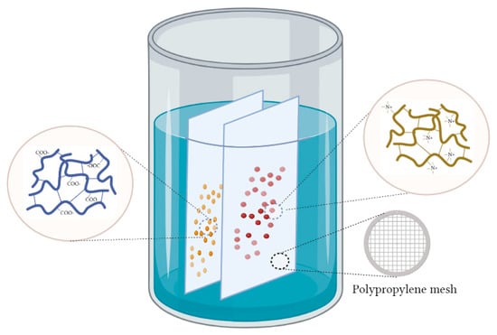 The activation of the interpolymer system is necessary to shift the ion exchangers into a highly ionized state by modifying their conformational and electrochemical characteristics through remote interaction [] (p.3). For this, the polypropylene meshes with swelling ion exchangers inside (Figure 4) were inserted at a distance of about 1–2 cm opposite each other in a glass with distilled water, establishing the interpolymer system “Lewatit CNP LF:AV-17-8” in a certain molar ratio (X:Y) (Figure 4). It should be mentioned that polypropylene meshes are widely used in various industrial and biomedical applications due to their unique properties, such as excellent chemical resistance, mechanical strength, and biocompatibility. One important aspect of their performance is their neutrality to aqueous media. Polypropylene is a non-polar thermoplastic polymer that is hydrophobic in nature, meaning it repels water. When polypropylene meshes are exposed to the studied aqueous environment, they remain chemically and physically stable due to their low solubility and excellent resistance to water [].