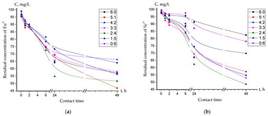 The present study employed the ICP-OES analysis (Figure 8) to confirm the obtained data, where at a ratio of 5:1 (Figure 8a), the low values (the highest sorption) of the residual concentration of europium ions in the solution can be observed. At a ratio of 2:4 (Figure 8b), the low values (the highest sorption) of the residual concentration of scandium ions in the solution were also detected. The obtained experimental data confirm the enhanced sorption activity of the interpolymer systems “Lewatit CNP LF:AV-17-8” (5:1) and “Lewatit CNP LF:AV-17-8” (2:4) towards europium(III) and scandium(III) ions, respectively, from their nitrate solutions.