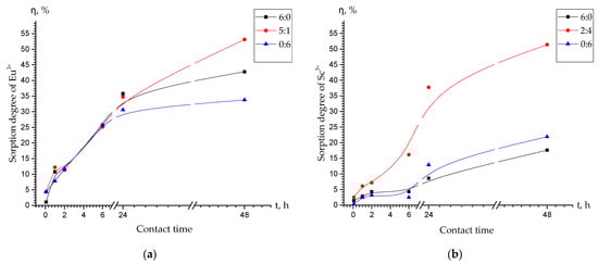 Figure 6 demonstrates, that the interpolymer systems Lewatit CNP LF:AV-17-8 (5:1) and Lewatit CNP LF:AV-17-8 (2:4) showed the highest sorption activity towards europium (Figure 6a) and scandium (Figure 6b) ions, respectively. As a result, the above-mentioned interpolymer systems were chosen for further detailed comparison with the raw Lewatit CNP LF (6:0) and raw AV-17-8 (0:6) ion exchangers (Figure 7). Figure 7a shows that after 48 h of interaction, the interpolymer system “Lewatit CNP LF:AV-17-8” (5:1) showed the maximum degree of europium ions sorption was equal to 53%, while raw Lewatit CNP LF (6:0) and raw AV-17-8 (0:6) showed 43% and 34%, respectively. On the other hand, Figure 7b represents that after 48 h of interaction, the interpolymer system “Lewatit CNP LF:AV-17-8” (2:4) showed the maximum degree of scandium ions sorption equal to 51%, whereas raw Lewatit CNP LF (6:0) and raw AV-17-8 (0:6) showed 21% and 16%, respectively.
