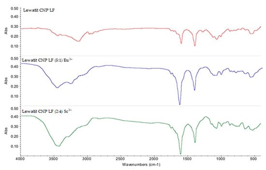 Figure 9 demonstrates the FTIR spectra of initial Lewatit CNP LF (without sorbed ions), Lewatit CNP LF (5:1) (with sorbed Eu3+ ions), and Lewatit CNP LF (2:4) (with sorbed Sc3+ ions). The changes in absorbance after the target REM sorption (wavenumbers interval 3300–2500 cm−1, which correspond to O-H stretching in the carboxylic group), wherein the values of absorbance in the case of the interpolymer systems disappeared, which, in turn, points to intense sorption of Eu3+ and Sc3+ ions by the interpolymer systems and possible replacement the hydrogen of the carboxylic group by sorbed metal ions.