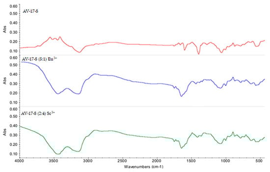 Figure 10 shows the FTIR spectra of initial AV-17-8 (without sorbed ions), AV-17-8 (with sorbed Eu3+ ions), and AV-17-8 (2:4) (with sorbed Sc3+ ions). Changes in absorbance after the target REMs sorption (wavenumbers interval 3400–3300 cm−1, which correspond to N-H stretching in the carboxylic group), wherein the values of absorbance in the case of the interpolymer systems disappeared, which, in turn, points to intense sorption of Eu3+ and Sc3+ ions by the interpolymer systems and possible replacement of the hydroxide group of the primary amine.