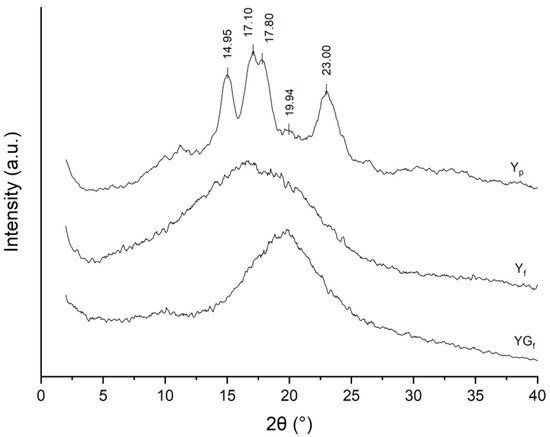 XRD patterns of Yf and YGf samples (Figure 3) were characterized by an amorphous halo, with the loss of crystalline features due to amorphization, confirming NMR results. The different position and intensity of the amorphous halo in YGf could be explained by chain–glycerol interactions.