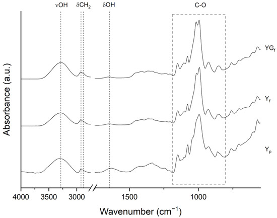FTIR-ATR spectra of Yp, Yf and YGf samples. Main bond vibrations are indicated.
