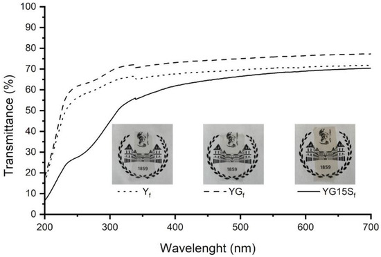 Starch-based nanocomposite films were prepared by adding sepiolite in different contents (i.e., 3, 5, 10 and 15% w/w with respect to starch). Uniform and transparent films were obtained (Figure 5), independently on the filler amount. The presence of sepiolite imparted a yellowish color to the films, which was more intense in the case of a higher filler content. The transparency of the samples was analyzed by UV–Vis spectroscopy: the acquired spectra are shown in Figure 5. To assess the effect of sepiolite, the film with the highest amount of filler (YG15Sf) was compared with a starch film (Yf) and a plasticized starch film (YGf). In the visible range, the effect of the addition of glycerol or sepiolite is negligible. In YG15Sf, an absorbance peak below 300 nm is detected, due to sepiolite Mg-O-Si bonds [35].