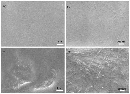 The morphology of the composite films was analyzed by SEM. As an example, Figure 6 reports SEM images of YG3Sf and YG15Sf films (i.e., lowest and highest value of filler content). The sepiolite clay filler, with its characteristic needle-like shape, is well-dispersed in the starch matrix, and its original dimensions are retained in the composite films. However, some agglomerates could be detected when 15% of sepiolite was introduced (Figure 6c,d).
