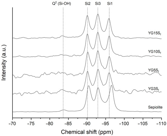 29Si CPMAS NMR spectra of pristine sepiolite in comparison with nanocomposite films with sepiolite at different loadings (YG3Sf, YG5Sf, YG10Sf and YG15Sf).
