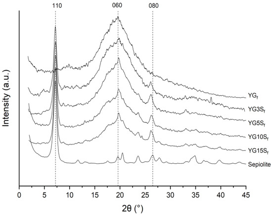 Diffractograms of pristine sepiolite, plasticized starch film (YGf) and nanocomposites films with sepiolite at different loadings (YG3Sf, YG5Sf, YG10Sf and YG15Sf).