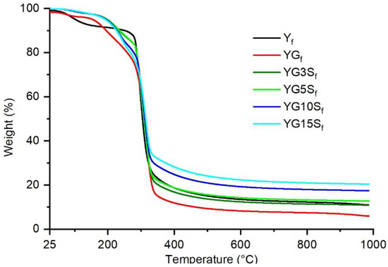 The non-plasticized unfilled starch film sample, Yf, showed two main weight loss events, the first close to 100 °C, due to loss of adsorbed water, and the second around 300 °C, attributed to the decomposition of starch. The glycerol containing films showed a reduced amount of adsorbed water. However, an additional weight loss event, between 150 °C and 260 °C, appeared, lowering the thermal stability of the plasticized films YGf with respect to the non-plasticized starch film Yf, as demonstrated by the lower T20 (Table 2). Such behavior was consistent with that observed in other studies of plasticized starch films [38] and was attributed to the decomposition of glycerol [39,40]. The composite films containing sepiolite showed a better thermal resistance compared to YGf, increasing the T5 of around 45 °C. However, by increasing the amount of sepiolite, the thermal stability slightly decreases (T20 decreases of around 20 °C from YG3Sf to YG15Sf). These different behaviors confirm the existence of complex interactions between sepiolite, glycerol and starch chains. Finally, the residual weights are consistent with the inorganic fraction of the samples, increasing with the filler amount.