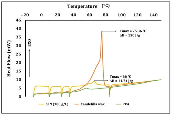 Figure 1 also shows the calorimetric assay of the SLN suspension (100 g/L), which showed a Tmax of 66 °C. This reduction in the melting temperature compared to the pure wax is due to the interaction of the lipid with the other ingredients that form the suspension, mainly the surfactant. Similarly, the reduction in the crystallinity due to these interactions lowered the ΔH required to carry out the transition (11.74 J/g). The reduction in the Tmax and ΔH was produced by the decrease in the chemical potential caused by adding the surfactant, which interacted with water to allow a plasticizer effect that reduced the heat required to modify the system phase. The reduction in the particle size (nm) also contributed to this behavior. García-Betanzos et al. (2016) [] reported a Tmax of 75.3–107 °C for SLN (100 g/L) made of Candeuba® wax; however, their particles had a size of ~227 nm, whereas the average particle size reported in our study was 850 nm.