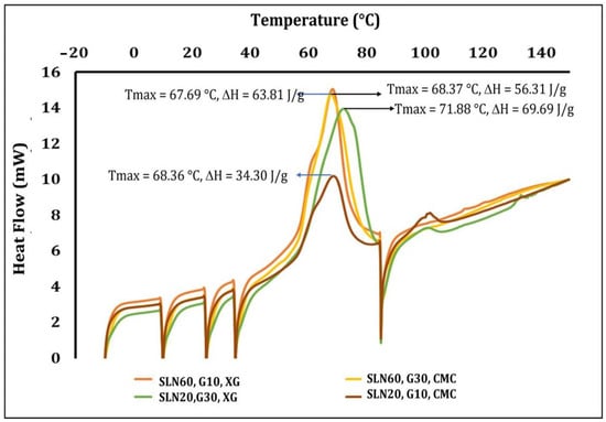 Figure 2 shows the thermograms of the films with SLN added at different concentrations. The formulation with the highest Tmax contained 60 g/L of SLN, 10 g/L of glycerol, and 3 g/L of XG (71.88 °C). The other formulations showed a Tmax of 67.69–68.37 °C. The ΔH was higher for both films with the maximum concentration of SLN added, but adding 30 g/L of plasticizer caused a greater decrease in this parameter (63.81 J/g) compared to adding only 10 g/L (69.69 J/g). The samples with 20 g/L of SLN added presented a ΔH of 34.30 J/g (30 g/L of glycerol) and 56.51 J/g (10 g/L). It has been suggested that increasing the glycerol content reduces the Tmax and ΔH in films made of fish gelatin starch, suggesting that the plasticizer decreases the intermolecular forces and improves polymeric-chain flexibility []. The behavior observed with the change in the ΔH was in contrast with the mechanical properties of films observed previously, where low ΔH values were associated with more flexible and elastic films.