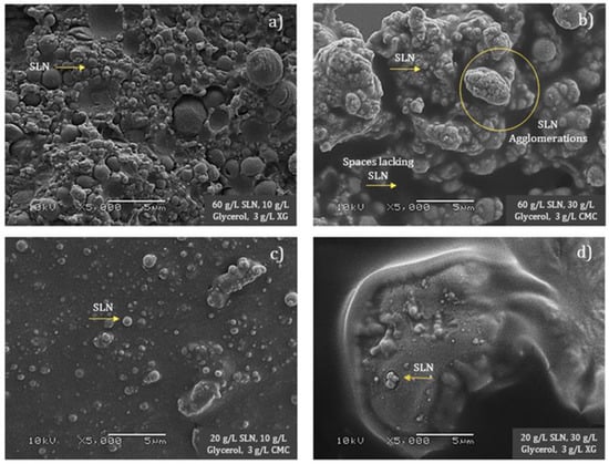 Microscopic surfaces of edible films prepared with 60 g/L of SLN, 10 g/L of glycerol, XG (a); 60 g/L of SLN, 30 g/L of glycerol, CMC (b); 20 g/L of SLN, 10 g/L of glycerol, CMC (c); and 20 g/L of SLN, 30 g/L of glycerol, XG (d).