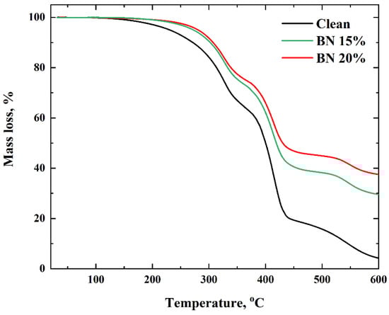 To evaluate the thermal stability of the composite samples with and without boron nitride, TGA was used from 20 °C to 600 °C, at a constant heating rate. Figure 3 shows the TGA curves for the composite samples. No significant difference is observed between the TGA curves for all samples and the clean polymer. The results reveal that the polymers loaded with BN are thermally more stable. Compared to the clean polymer, the filled samples start to degrade at higher temperatures, and the rates of weight loss decrease remarkably. Thus, the clean polymer starts to degrade at ~160 °C, while the polymer samples filled with BN degrade at ~214 °C. The enhancement of thermal stability may be attributed to the incorporation of BN flakes, which can inhibit the mobility of polymer chains and help capture free radicals generated during pyrolysis. Furthermore, all polymer and polymer-composite samples were found to degrade mostly through a two-step reaction. The thermal degradation occurs in two steps at the temperature ranges of 160–360 °C and 360–440 °C [32], for a heating rate of 5 °C/min. The first step is due to the degradation of thermally weaker bonds, terminal groups, and initiator residue situated in the polymer chain, while the second step can be attributed to random scission and chain depolymerization [33,34].