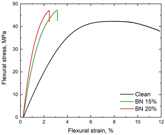 Flexural stress–strain curve for the clean polymer and the polymer composites with 15% and 20% BN.