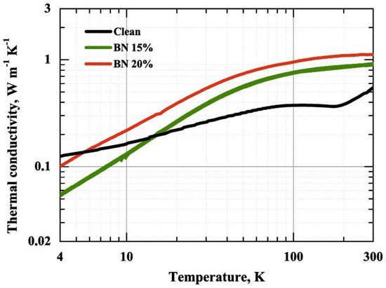 Thermal conductivity was measured for all samples in the range of 3–300 K (Figure 5). The addition of BN flakes has a significant effect on the thermal conductivity of the resulting composites, increasing it by a factor of two at room temperature in the case of the 20% BN-filled sample. The obtained results are in accordance with previous measurements for polymer/semiconductor composites, e.g., [40].