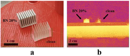 One minute after the hotplate was heated to 100 °C, an image was captured with a Fluke Ti450 thermal imager (Fluke Corporation, USA). The image shows two points with the temperature at the same height from the base of the samples, corresponding to a sample of the BN-filled photopolymer and a sample of the pure photopolymer material (Figure 6b). The temperature at the point set in the middle of the side of the BN-filled sample is 57.9 °C, and the temperature at a similar point of the clean polymer sample is 40.7 °C. The thermal image also shows that the heating of the sample with boron nitride is more uniform.