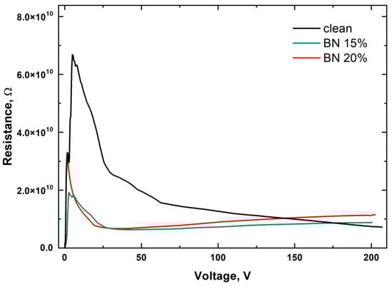 Filling the photopolymer with boron nitride leads to a change in the behavior of the curve. Similar to the pure polymer, an increase in resistance is observed, but it is less significant. Then, as the voltage increases, the resistance increases. This increase in resistance can be explained by the presence of boron nitride, which aims to line up in the field, as shown in the DFT calculations. This alignment leads to an increase in resistance.
