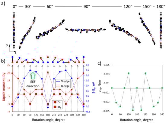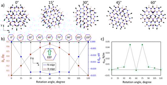 The DFT can be a powerful tool to reveal an EEF’s influence on a structure at the atomic level. In Figure 9, we present the results of the investigation of EEF influence on BN flakes and their spatial orientation. The atomic forces acting on each atom of BN flakes under the EEF depends on their spatial orientation in the XY plane, as presented in Figure 9a. We rotated the BN flakes with a step of 15°. A dominant orientation of forces along the EEF direction was observed. It was found that applying an EEF to the BN flakes led to a change in the total dipole moment of the flakes with respect to the changes in the total energy. In Figure 9b, the dependence of the y-component of the dipole moment (Dy, red dots) and total energy difference (blue dots) on the rotation angle is presented. It was found that the minimum total energy of the BN flakes under the applied EEF corresponds to 60° of rotation angle (armchair direction of BN flakes) with a maximum y-component of the dipole moment. It is important that the difference between the atomic structures of the BN flakes with 0° and 60° of rotation angle is the edge termination along the EEF direction. In the case of N-B termination (60°), the Dy is maximum, while the B-N termination leads to a minimal value of Dy. In Figure 9c, the dependence of the xy components of the mechanical stress tensor is presented. Two minimums at 0° and 60° are found, which show the stationary spatial orientation of the BN flakes within the applied EEF. The obtained results show that under the action of the EEF, BN flakes tend to orient along the EEF direction.