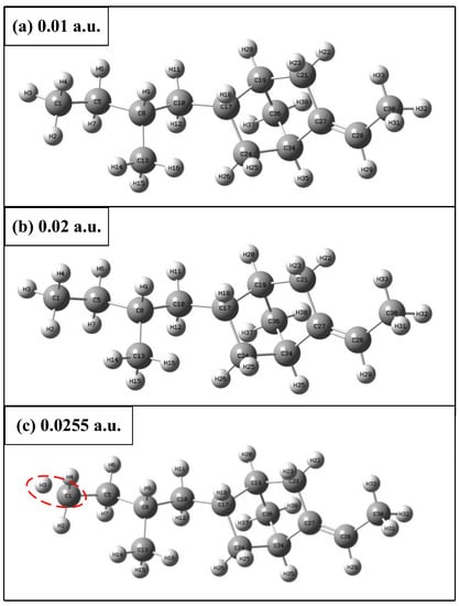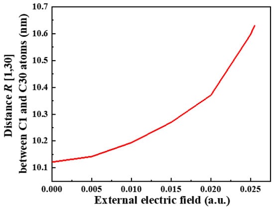 After optimizing the ENB-EPDM molecule to obtain a stable spatial structure, the variation trend of distance R [1, 30] between the leftmost C1 atom and the rightmost C30 atom of the molecular chain under different external electric fields (0~0.0255 a.u.) is shown in Figure 4, which gradually becomes larger with the increase in the electric field intensity. Due to the effect of an electric field, the positive and negative charges transfer in the molecular system, which produces a certain stretch effect on the molecular chain and reduces the stability of the molecular geometric structure. The dynamic changes of the ENB-EPDM molecular chain under different electric field intensities are shown in Figure 5, where the direction of the applied electric field is the trend of the molecular chain extension. When the electric field intensity reaches 0.0255 a.u., the C-H bond of the ENB-EPDM molecule is broken, as shown in Figure 5c.