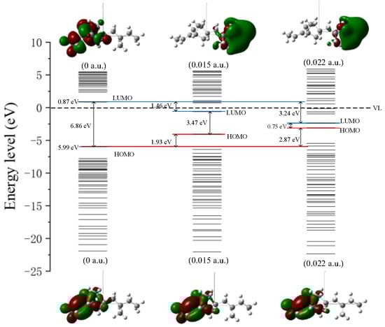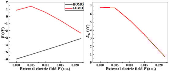 According to the frontier orbital theory, the energy of the highest electron occupied orbital (HOMO) in a molecule is the highest, the electron is the least bound, and the transition is the most likely to occur. The lowest unoccupied orbital (LUMO) has the lowest energy of all unoccupied orbitals and accepts electrons the most easily. The energy gap (Eg) between the HOMO and the LUMO of the front orbital is a measure of the electron’s ability to move from an occupied orbital to an empty one, and it is often used to measure the molecule conductivity. The smaller Eg is, the better the conductivity of the molecule is, and the easier it is for electrons to transition from the HOMO to LUMO orbitals. As shown in Figure 6, the HOMO orbital energy level is −5.99 eV and the LUMO orbital energy level is 0.87 eV without an external electric field. When the electric field intensity reaches 0.022 a.u., the HOMO orbital energy level becomes −3.11 eV, and the LUMO orbital energy level becomes −2.37 eV. At the same time, Eg between the HOMO and LUMO orbitals is constantly decreasing, so that the electrons bound in the molecular orbital are easier to transition from the HOMO orbital to the LUMO orbital, and the conductivity of the molecule is becoming better and better. When Eg is reduced to a certain value, the electrons can move freely inside the material to form a current. Atoms or groups at the locations of HOMO and LUMO orbitals have the highest reaction activities, and are more likely to react with other molecules or free radicals, resulting in the breakage of molecular chemical bonds and the disintegration of molecular chains, resulting in the decline of insulating properties of insulating materials.