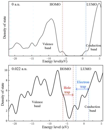 The results calculated using the Gaussian software are then processed using Multiwfn software using the default parameters, with each orbital having a strength value of 1, and the degeneracy using the default 0.005 eV threshold. Figure 8 shows the molecular chain of ENB-EPDM before the electric field is applied, and the electric field strength is 0.022 a.u. From the density of states (DOS) distribution, it can be seen that under the action of an electric field, a certain amount of deep trap and shallow trap energy level distribution appears near the valence band and the conduction band of the ENB-EPDM molecular chain. With the continuous action of an electric field, the density of trap energy levels formed by molecular orbitals will further increase. The HOMO orbital energy level shifts to a higher energy level, which introduces more hole traps near the valence band. The LUMO orbital energy level moves to the lower energy level direction, more electron traps are introduced near the conduction band, and the number of electron traps is more than the number of hole traps. The difference between the number of holes and electron traps indicates that the effect of the electric field will make the molecular chain of the ENB-EPDM more likely to capture free electrons or injected charges, resulting in a distortion of local field strength inside the material.