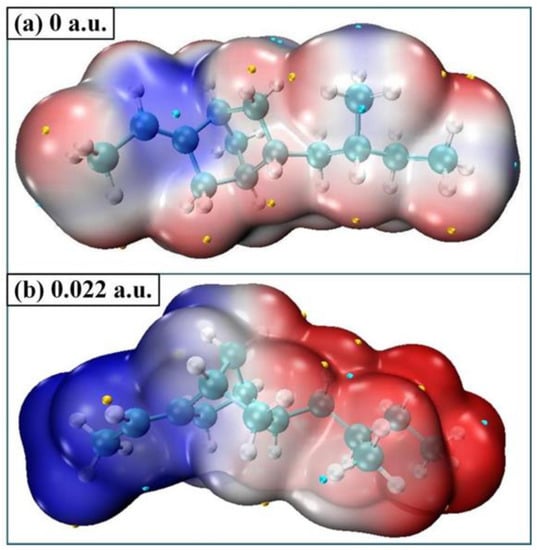 Figure 9 shows the surface electrostatic potential distribution of ENB-EPDM molecules, which can be used to predict the reaction active site. The atoms corresponding to the positions with more negative electrostatic potential on the molecular surface are more likely to have electrophilic reactions, and the atoms corresponding to more positive positions are more likely to have nucleophilic reactions. The depth of color on the electrostatic potential map of the molecular surface reflects the strength of the electrostatic potential. The positive electrostatic potential region is represented by red, and the negative electrostatic potential region is represented by blue. The yellow sphere corresponds to the point of maximum electrostatic potential, and the green sphere corresponds to the point of minimum electrostatic potential. It can be seen from the molecular electrostatic potential surface that the global minimum value of the electrostatic potential of the molecular surface is near the C=C bond of the carbon ring, showing a relatively strong degree of electronegativity, with more surrounding electrons and a higher density, which has electrophilic activity and is prone to electrophilic reactions. The global maximum value of the electrostatic potential on the molecular surface is near the hydrogen atom on the surface, indicating that this region has a high degree of nucleophilicity and is prone to nucleophilic reactions. When the electric field intensity reaches 0.022 a.u., the electrostatic potential distribution of the molecular surface shows a great difference, and the positive electrostatic potential and the negative electrostatic potential are displayed on the left and right sides of the chain, respectively. The above results can be speculated that when the ENB-EPDM molecules are subjected to an external electric field, the chemical bond is broken at the maximum or minimum electrostatic potential due to its strong reaction activity. When the insulating material is subjected to an extreme field strength, the chemical bond in the weak position inside the material gradually breaks, which causes the change of the dielectric constant of the material, and finally the overall insulation performance of the material decreases, breaking through the insulation level of the electrical material, resulting in electrical breakdown. In electrical engineering, even if the insulation level of the insulating materials decreases at one location, it is easy to cause electrical failure and electrical breakdown without waiting until the overall insulation level of the insulating materials decreases.