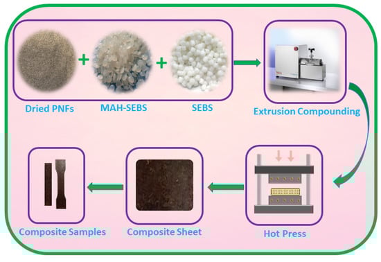 To remove any present moisture on the raw materials, first, PNFs, SEBS, and MAH-SEBS were oven-dried overnight at 60 °C. The oven-dried reinforcing PNFs, matrix polymer SEBS, and MAH-SEBS compatibilizer were mixed manually by varying the PNF contents from 10 to 30 wt% with a fixed compatibilizer content of 5 wt%. The compositions of the constituents of the PNF/SEBS composites are recorded in Table 1. The mixtures of matrix polymer, reinforcing fibers, and compatibilizer were compounded using a twin screw compounder (HAAKE™ MiniCTW Micro-Conical, Thermo Fisher Scientific) using the temperature from 175 °C to 185 °C at a mixing speed of 140 rpm. Further, the compounded PNF/SEBS composites were hot pressed at 190 °C to obtain sheets of size 15 cm × 15 cm. Finally, according to the standard used, the composite samples were cut from the sheets for testing and characterization. In this study, the compatibilizer MAH-SEBS used to improve the fiber/matrix adhesion in the PNF/SEBS composite had a 99 wt% identical polymer backbone that is easily and completely miscible with the SEBS polymer matrix and has only 1 wt% maleic anhydride groups grafted to this identical backbone. Thus, with a 99% identical backbone, adding the MAH-SEBS into a neat SEBS polymer matrix may not exhibit any significant effect on the properties or may not change the material’s behavior. Therefore, the neat SEBS sample was considered as the reference sample for the comparison in this study. The composite preparation method is shown in Figure 1.