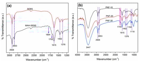 The FTIR spectra of the SEBS polymer and the MAH-SEBS compatibilizer are recorded in Figure 2a. In the spectra of both SEBS and MAH-SEBS, the bands between 3000 to 2800 cm−1, at 2926 cm−1 and 2853 cm−1, designate the vibrations of the methylene of the aliphatics groups. The bands at 1462 cm−1 and 1376 cm−1 designate the bending vibrations of the CH2 and CH3, and the band at 1615 cm−1 designates the C=C stretching of the aromatic ring of polystyrene of SEBS and MAH-SEBS. Two bands validate the presence of the MAH group in MAH-SEBS at 1804 cm−1 and 1702 cm−1 that do not exist in the SEBS spectrum. The 1702 cm−1 band shows the C=O asymmetric stretching of a cyclic anhydride of MAH-SEBS and confirms maleic anhydride grafting on the SEBS, whereas the 1804 cm−1 band shows the C=O of the maleic acid groups that may form by absorbing moisture from the environment [4]. The spectra of PNF/SEBS composites recorded in Figure 2b indicate that the band of C=O at 1702 cm−1 shows shifting to the higher wavenumber at 1745 cm−1. This band at 1745 cm−1 confirms the formation of strong ester bonds (–CO–O–) between the anhydride groups of the MAH-SEBS compatibilizer and the hydroxyl groups of the lignocellulosic PNFs. The SEBS backbone of the MAH-SEBS compatibilizer, identical and miscible, becomes completely mixed into the polymer matrix, and the functional MAH grafted onto its backbone reacts with the hydroxyl groups of the PNFs, forming strong covalent ester bonds. It indicates the strong interfacial adhesion between the PNFs and the SEBS (Figure 3).