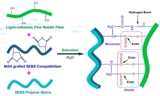 For a composite material, in addition to the properties of the reinforcing fiber and the matrix, the fiber/matrix interface also plays a significant role in determining the final mechanical performance of the resultant composite [38]. Thus, the fiber/matrix interfacial adhesion is a major factor in determining the response of a composite to an applied load and its integrity under stress governing the properties of that composite. Lignocellulosic plant fibers that are hydrophilic and polar do not adhere well to hydrophobic and non-polar polymer matrices in their composites; consequently, the mechanical performance of the composites is adversely affected. An efficient way to improve the mechanical characteristics of the incompatible phases is to use compatibilizers or coupling agents that join the natural fiber reinforcement and the matrix polymer in the composite [39]. The compatibilizers are typically functionalized polymers which have a matrix-compatible backbone and functional groups attached to this backbone that can interact with the reinforcement [40]. Several coupling agents and their functions as compatibilizers in composites made of natural fibers and polymers were investigated [40,41]. Maleic anhydride-grafted SEBS (MAH-SEBS) has a great advantage in being used as a compatibilizer with the SEBS matrix, as it has an identical polymer backbone that can easily be miscible with the SEBS polymer, and maleic anhydride groups attached to it may form covalent bonds with the natural fibers. Previously, MAH-SEBS was also used as a compatibilizer to improve the adhesion in pineapple leaf fiber-reinforced SEBS composites [35,36].