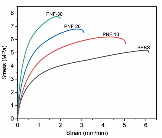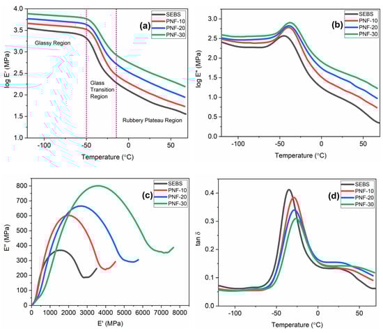 The tan δ plots of each material are recorded in Figure 7d. Generally, the temperature peaks in decreasing order are denoted as α and β peaks, indicating the glass transition temperature (Tg) and secondary sub-glass transition temperature of a polymer, respectively; for copolymers that do not have a secondary glass transition temperature, these two peaks represent the Tg of the two components of the copolymers [56]. As for TPE, SEBS and its composite samples were recorded between −120 °C and 70 °C. It was challenging to record the peaks for the thermoplastic and elastomeric blocks, and only the peak for the elastomeric ethylene-butylene (EB) block was recorded. Accordingly, the peaks of tan δ vs. temperature plots (Figure 7d) of the matrix and the composites only indicate the Tg of the elastomeric blocks. The peak of the tan δ plot of the matrix polymer indicates the Tg at −35.13 °C for the elastomeric EB blocks of SEBS. The peaks of the tan δ plot of PNF-10, PNF-20, and PNF-30 composites indicate their Tg values at −29.52 °C, −27.64 °C, and −25.38 °C, respectively (Table 3) for elastomeric EB blocks. It is observed that adding PNF in the SEBS matrix shifts the Tg of the EB blocks of the composites to the higher temperature showing all the composites at significantly higher Tg values than that of the SEBS.