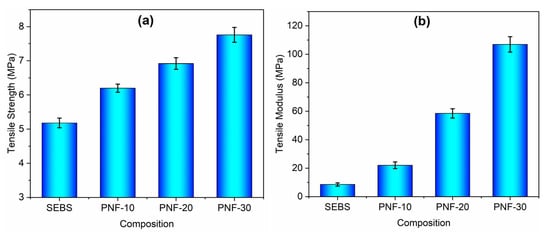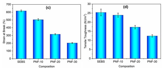 Tensile properties of the PNF/SEBS composites: (a) tensile strength, (b) tensile modulus, (c) tensile strain at break, and (d) tensile toughness.