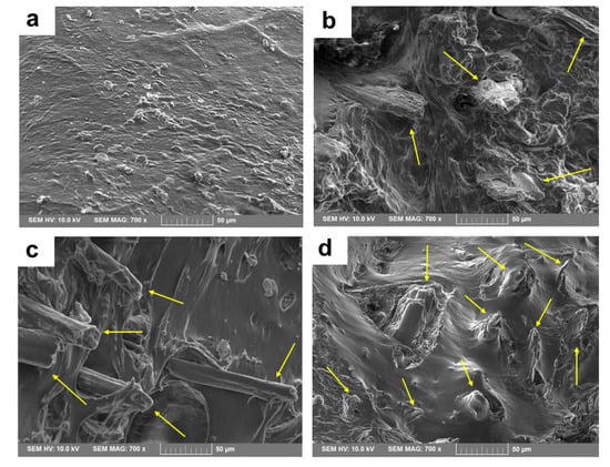 Figure 6 records the SEM pictures of the fractured surfaces of the PNF/SEBS composite specimens after the tensile test. The SEM image of the neat SEBS matrix (Figure 6a) exhibits a single-phase smooth surface without any filler or defects or flaws. The SEM pictures of each composite (Figure 6b–d) reveal that the SEBS matrix encases the reinforcing PNFs which are completely wrapped within the matrix: more fibers are shown for the composites with increasing reinforcing fiber contents. Moreover, irrespective of their fiber contents, the SEM pictures of all composites exhibit fiber breaking rather than fiber pull-out without any voids or gaps, representing the excellent fiber/matrix interfacial adhesion between the PNFs and the SEBS polymer with the MAH-SEBS compatibilizer. Furthermore, there is a chance that fibers may break during the extrusion compounding process of the composites. Hence, the final reinforcing fiber length in the composite for some fibers could be shorter than the initial length, 0.5 mm. However, it is challenging to determine the fiber length in the composites. As the composites’ tensile behavior improves with the fiber contents rising in the progressive composite compositions, the fibers in the composites have an effective length and aspect ratio.